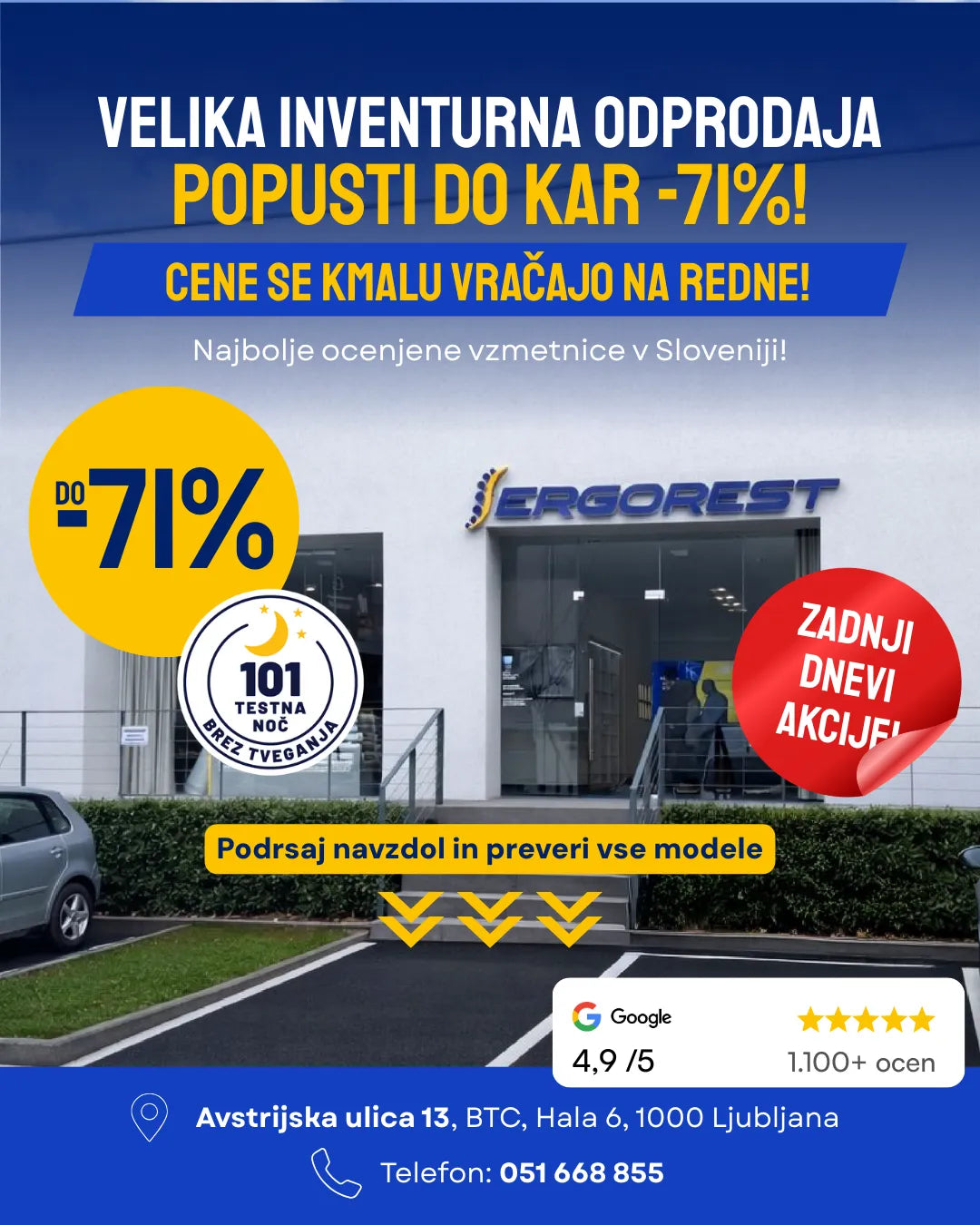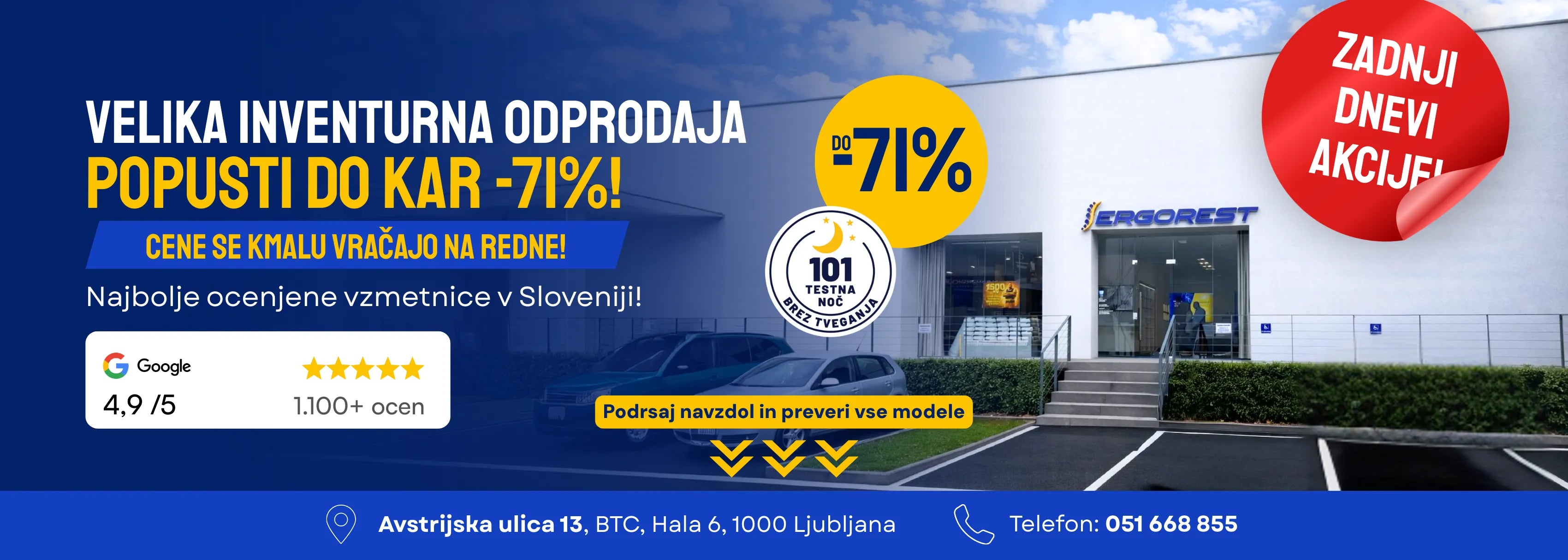 Druga možnost pa je klasična, a še vedno nepogrešljiva: obisk v fizičnih salonih Ergorest. Vabljeni, da nas obiščete v katerem od naših razstavnih prostorov, kjer lahko v živo preizkusite različne modele, trdote in materiale. Na voljo vam bo strokovno svetovanje, ki temelji na dejanskem znanju in izkušnjah – ne na naključnih priporočilih.