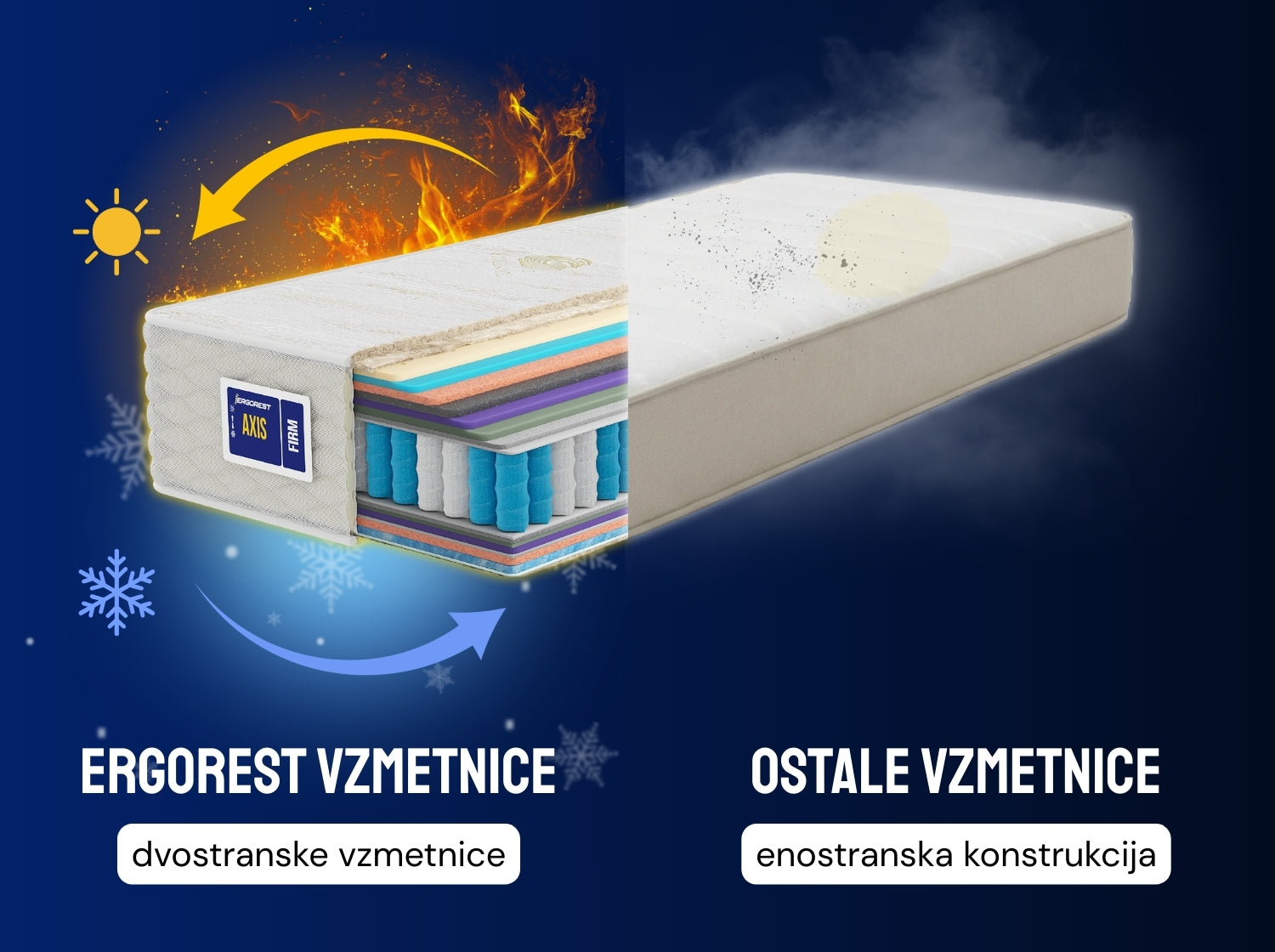 Ergorest je zavestno izbral bolj kompleksen in kakovosten pristop: pravo dvostransko vzmetnico, ki je enako funkcionalna na obeh straneh in ima jasno ločeno poletno in zimsko stran. To pomeni pametnejšo porabo materialov, boljšo termoregulacijo, večjo stabilnost in občutno daljšo življenjsko dobo.