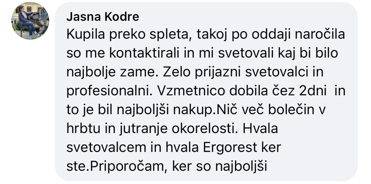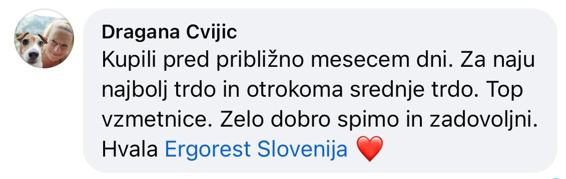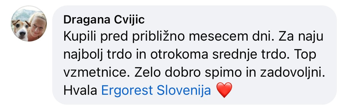 Top izkušnja z Ergorest posteljo in vzglavnikom. Res nisem vedela, koliko razlike lahko naredi dobra postelja, dokler nisem preizkusila Ergorest. Spanje je končno udobno, zjutraj pa me ne boli več hrbet ali vrat. Vzglavnik je noro dober lepo podpre glavo in vrat.