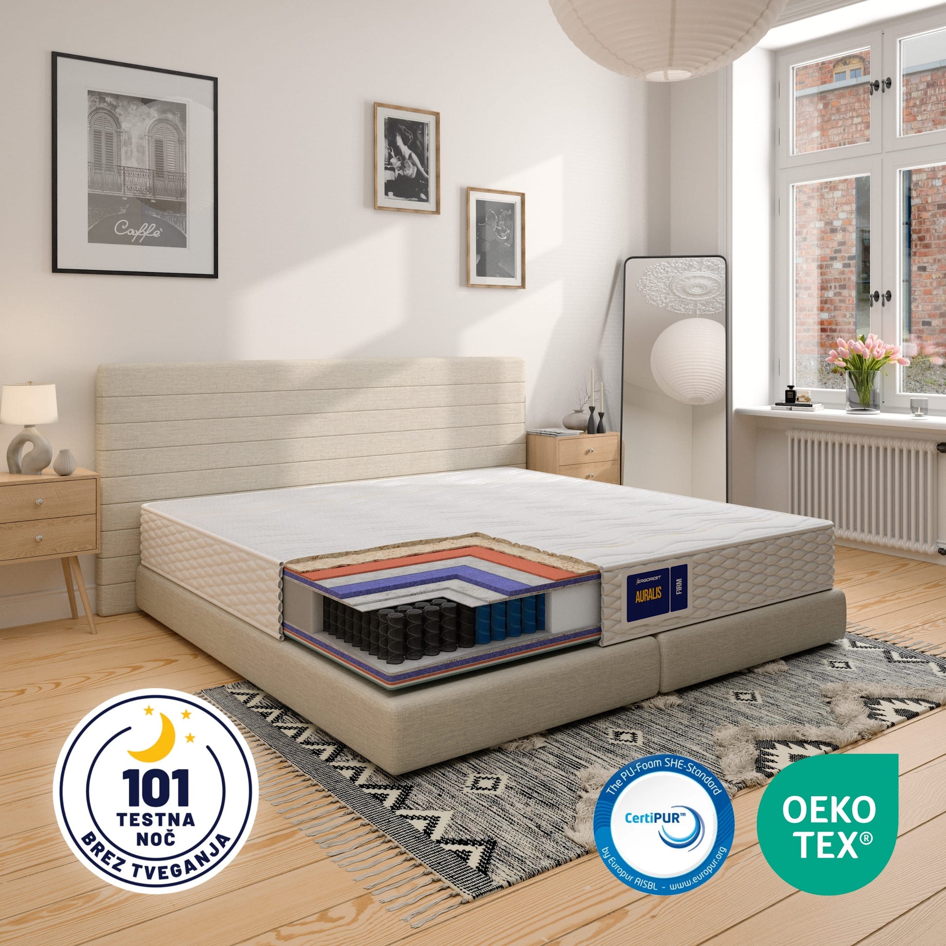 Auralis ni zasnovana kot »učinek wow«, temveč kot preprosta, zanesljiva rešitev za vse, ki želijo spati na preverjenih materialih, brez presežkov – a tudi brez razočaranja. Trpežna, čista in stabilna – to je vse, kar vzmetnica v tem razredu mora biti.