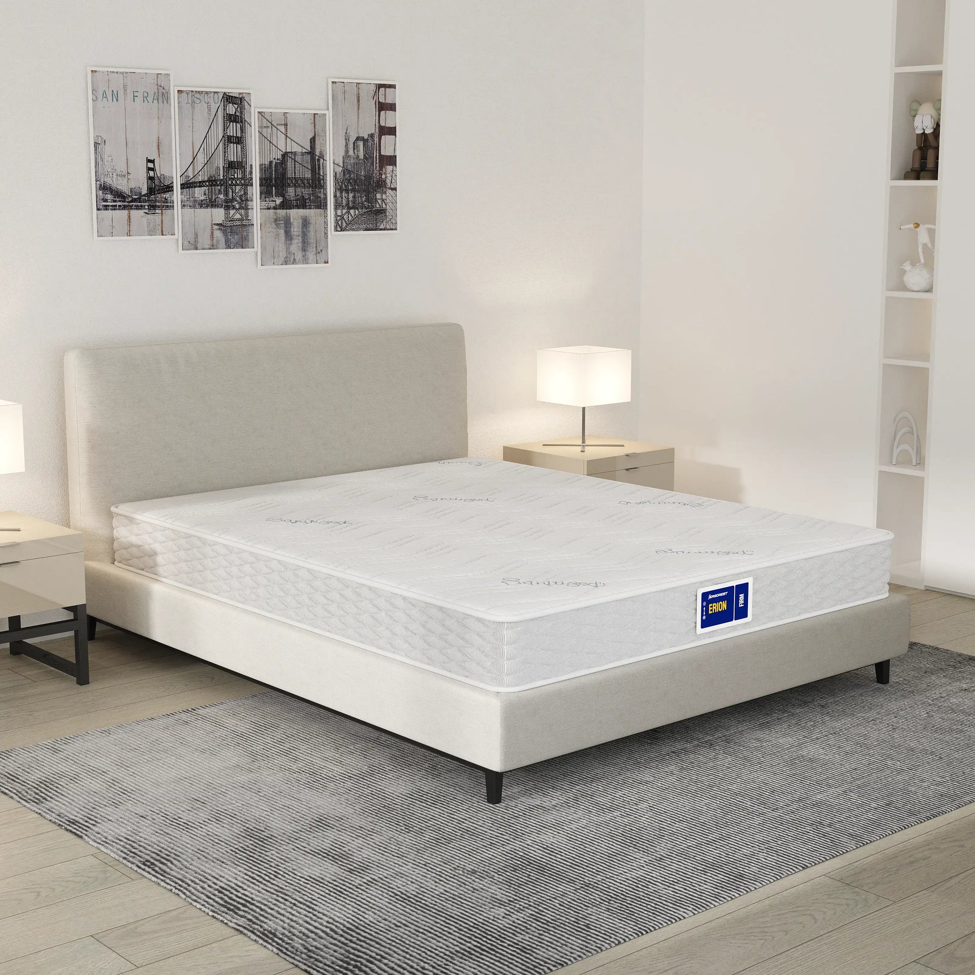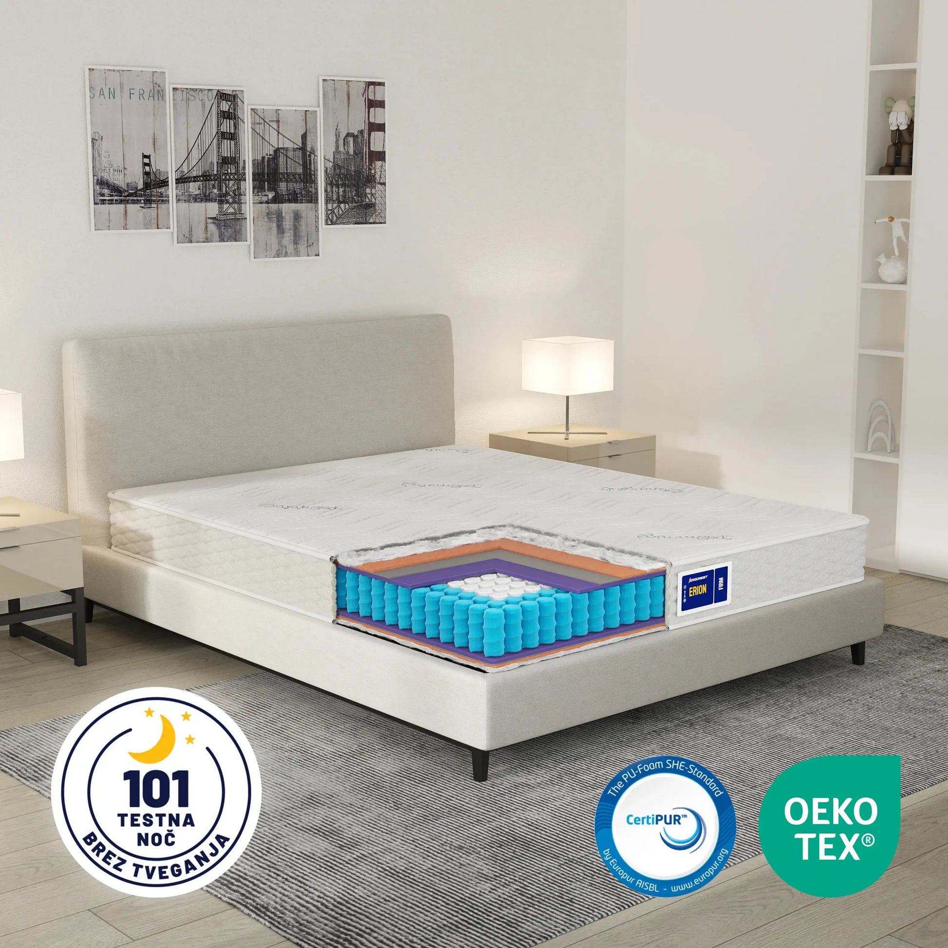 Stabilna vzmetnica brez pogrezanja – za miren spanec vsak dan. Erion je klasična 20 cm vzmetnica z žepkastim vzmetenjem, namenjena vsem, ki želijo zanesljivo podporo, čvrst občutek in miren spanec brez prenosa gibanja.