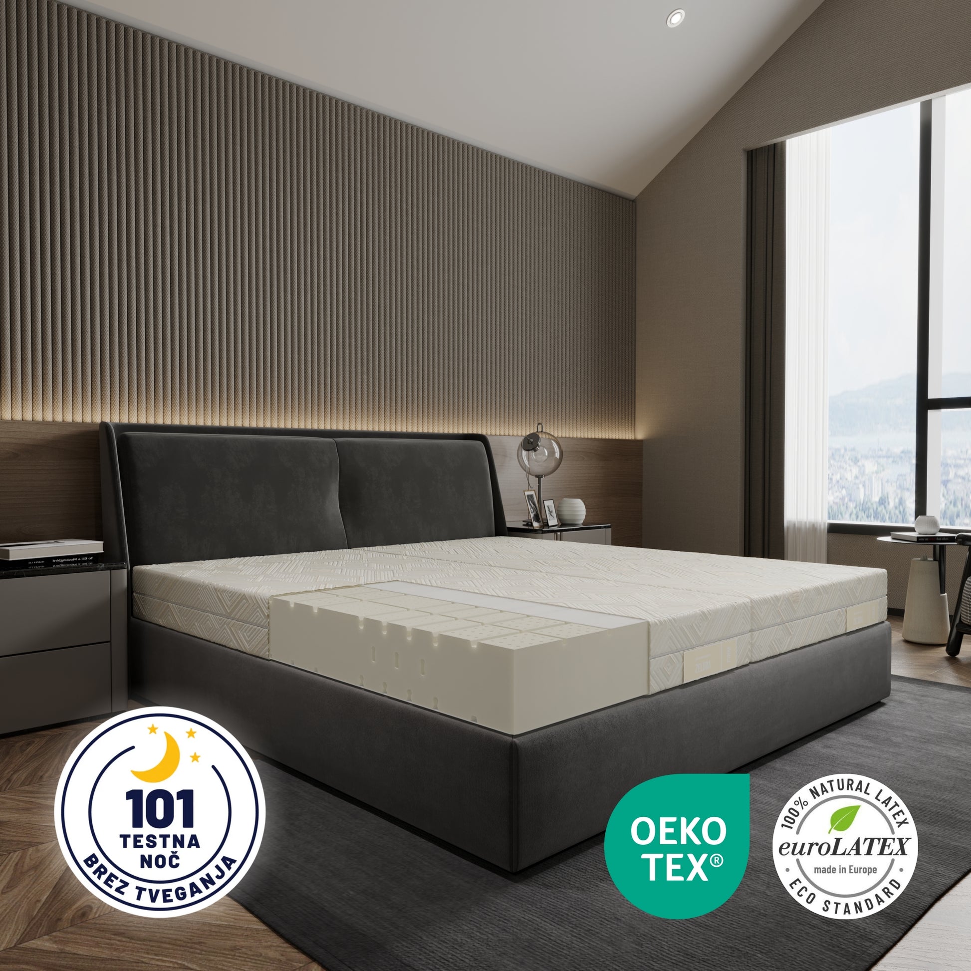 Zelora je premium naravno ležišče z jedrom Emerald Latex Core iz naravnega lateksa belgijskega proizvajalca Novaya, zaščitno plastjo EcoShield™ ter prestižno snemljivo prevleko LinenPure™ iz finega evropskega lanu.